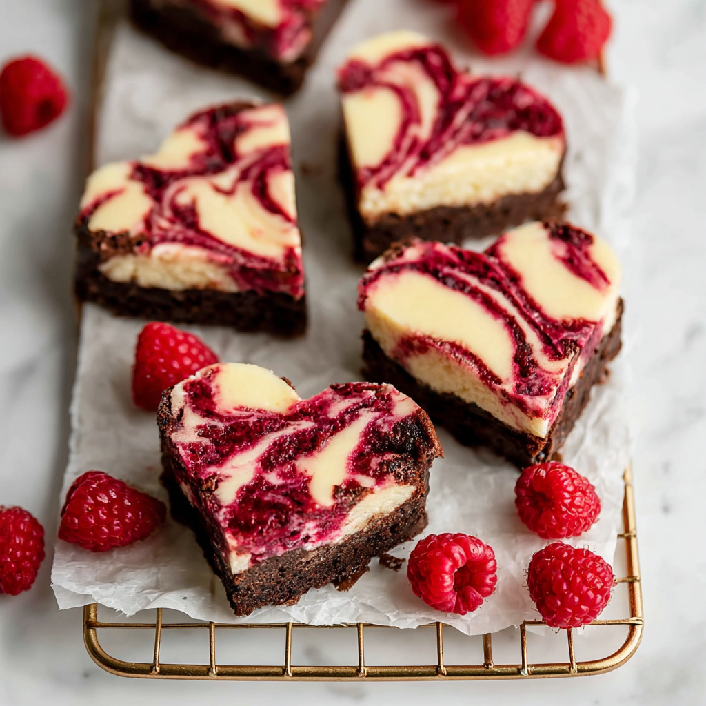 Heart-Shaped Brownies with Swirled Cheesecake and Raspberry Sauce